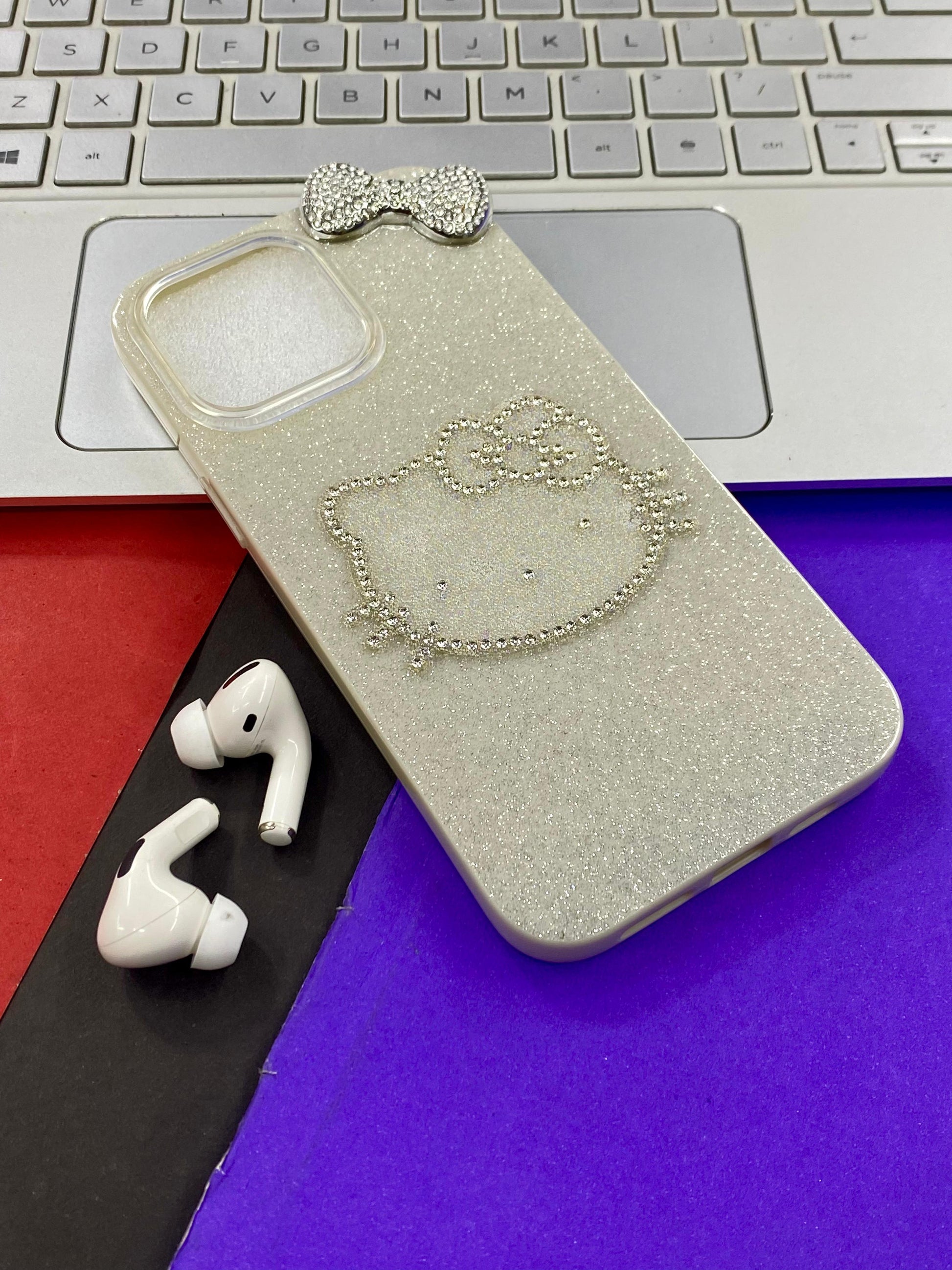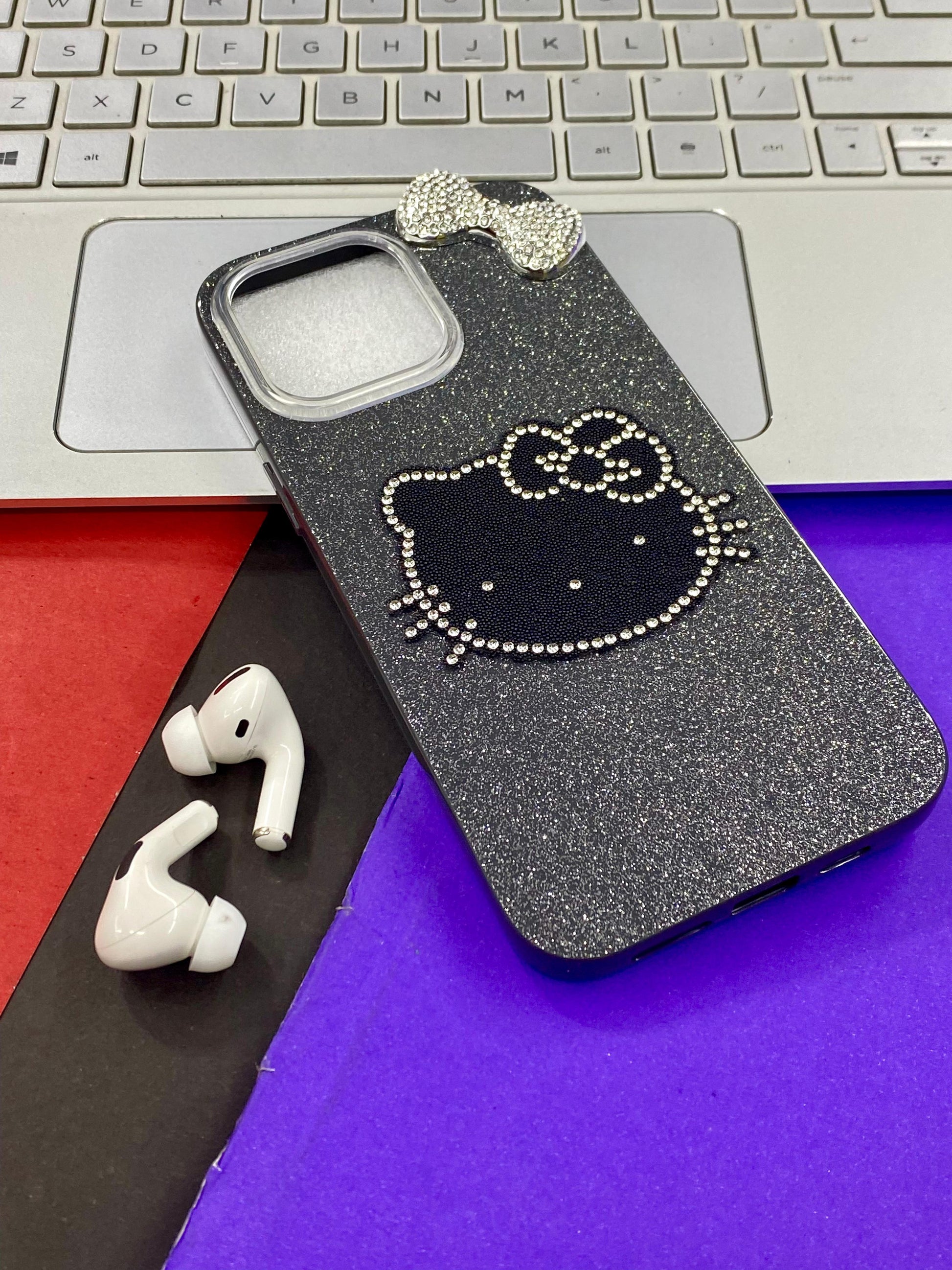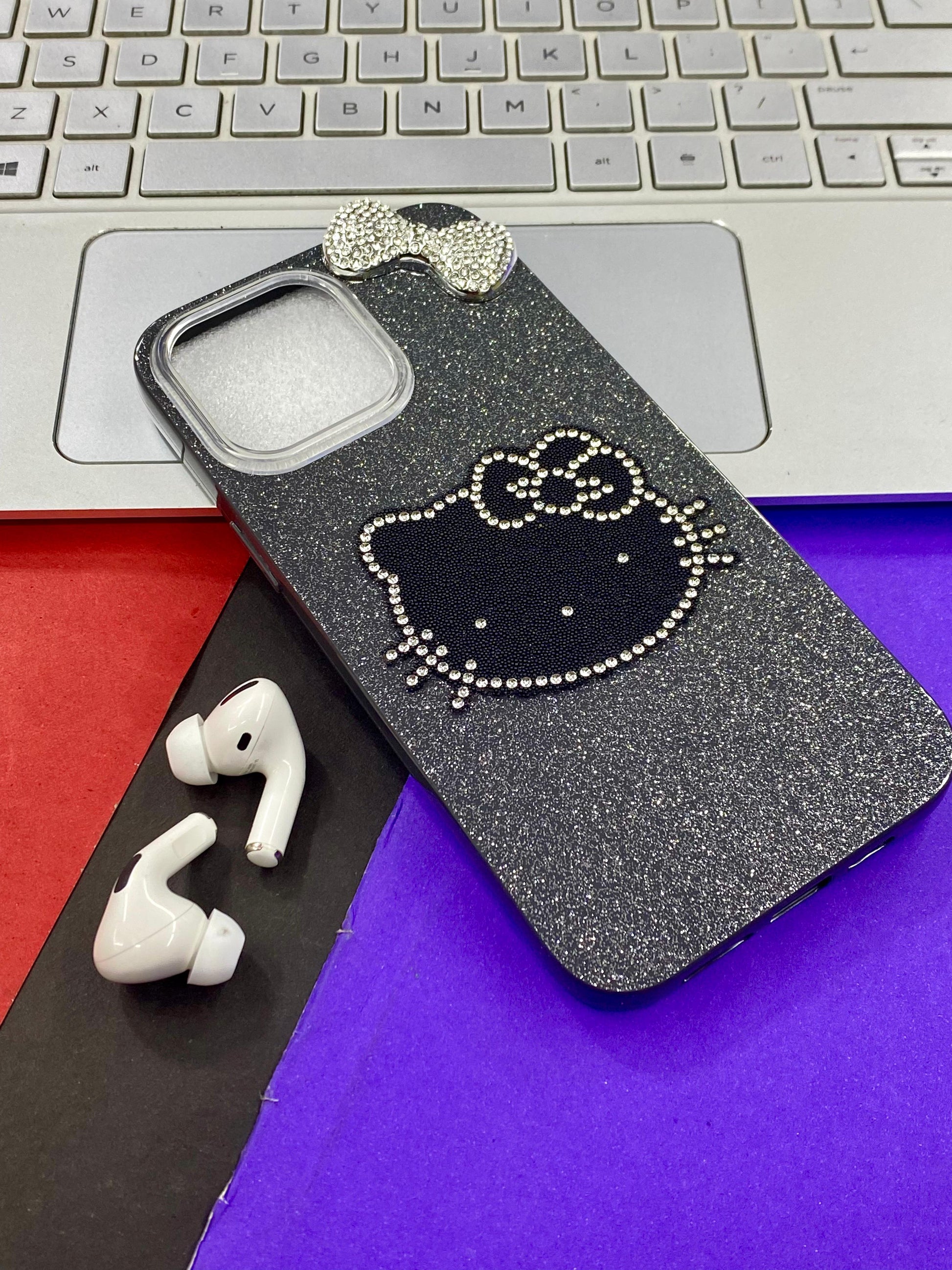 Phone case with Hello Kitty design - Black and sparkly material The case's design and materials suggest it is intended for fashion-conscious individuals who appreciate kawaii aesthetics.