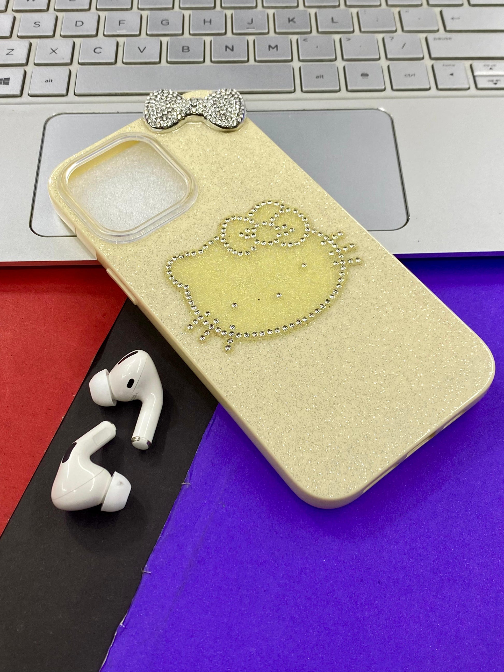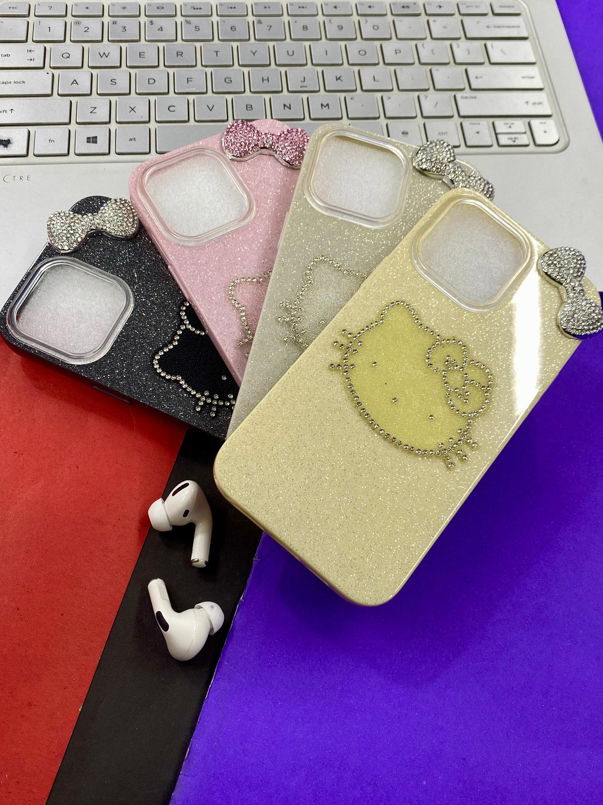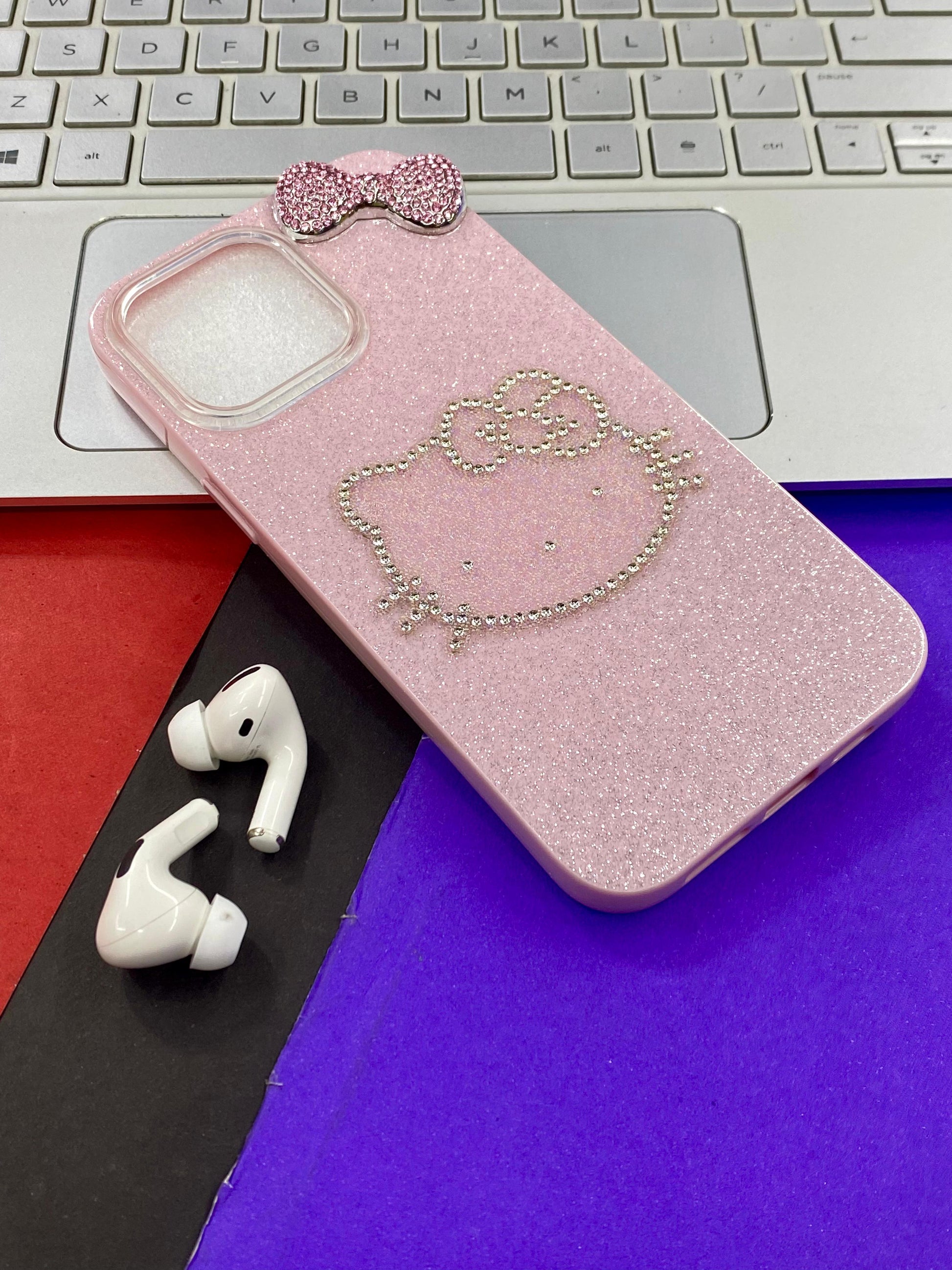 Phone case with Hello Kitty design - Black and sparkly material The case's design and materials suggest it is intended for fashion-conscious individuals who appreciate kawaii aesthetics.